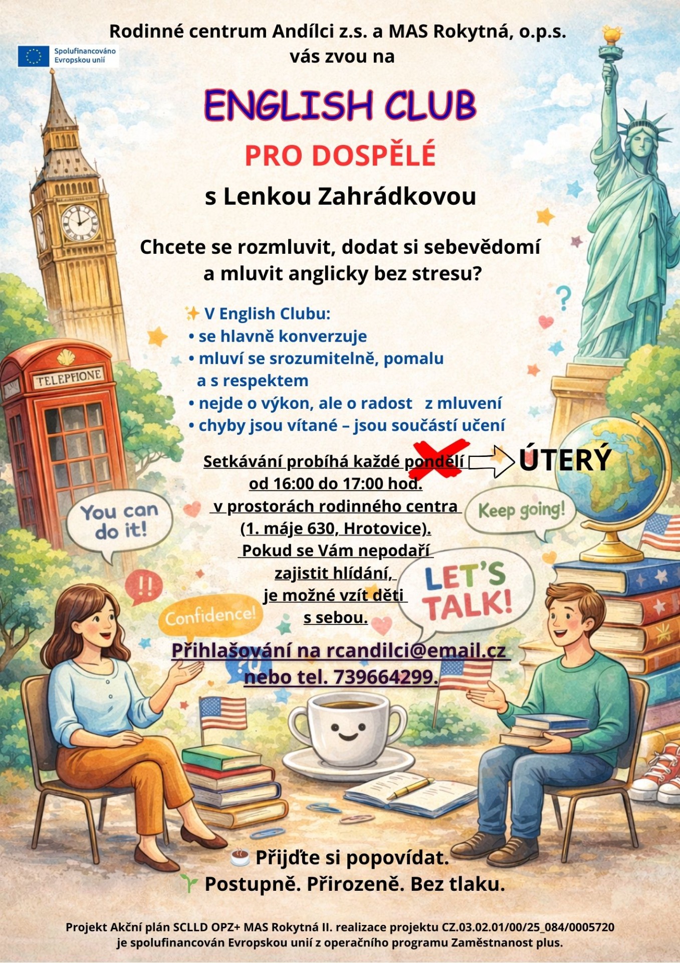 Z důvodu velkého zájmu o změnu jsme English club přesunuli na úterý. Začínáme 13.1.2026, ale není problém se přihlásit i později.